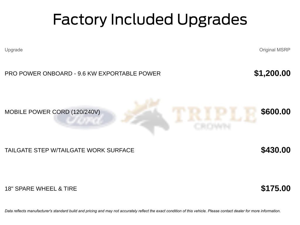 20 wheels, tailgate step & work surface, mobile power cord (120V/240V), BlueCruise 90-day trial. MSRP options shown on the sticker also include the Pro Power Onboard 9.6kW upgrade.