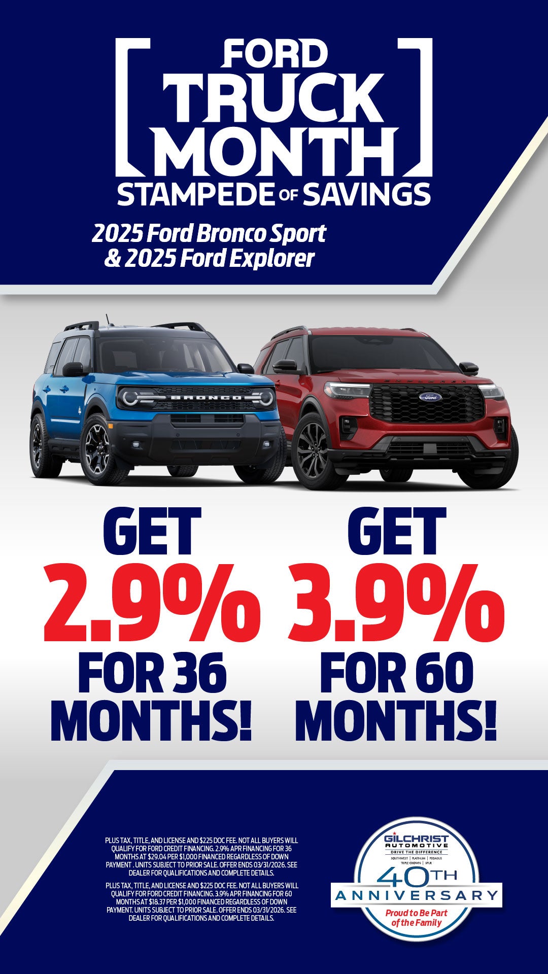PLUS TAX, TITLE, AND LICENSE AND $225 DOC FEE. NOT ALL BUYERS WILL QUALIFY FOR FORD CREDIT FINANCING. 2.9% APR FINANCING FOR 36 MONTHS AT $29.04 PER $1,000 FINANCED REGARDLESS OF DOWN PAYMENT. UNITS SUBJECT TO PRIOR SALE. OFFER ENDS 03/31/2026. **DOES NOT INCLUDE DEALER ADD ONS OR ADDED ACCESSORIES. SEE DEALER FOR COMPLETE DETAILS.*** NEEDS TO BE ON ALL DISCLOSURES SEE DEALER FOR QUALIFICATIONS AND COMPLETE DETAILS. PLUS TAX, TITLE, AND LICENSE AND $225 DOC FEE. NOT ALL BUYERS WILL QUALIFY FOR FORD CREDIT FINANCING. 3.9% APR FINANCING FOR 60 MONTHS AT $18.37 PER $1,000 FINANCED REGARDLESS OF DOWN PAYMENT. UNITS SUBJECT TO PRIOR SALE. **DOES NOT INCLUDE DEALER ADD ONS OR ADDED ACCESSORIES. SEE DEALER FOR COMPLETE DETAILS.*** OFFER ENDS 03/31/2026. SEE DEALER FOR QUALIFICATIONS AND COMPLETE DETAILS.