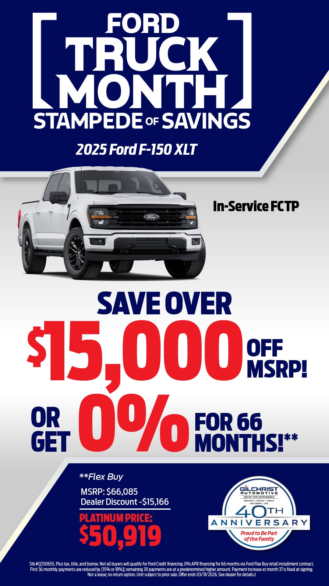 Stk #Q250655. Plus tax, title, and license. Not all buyers will qualify for Ford Credit financing. 0% APR financing for 66 months via Ford Flex Buy retail installment contract. First 36 monthly payments are reduced by [15% or 18%]; remaining 30 payments are at a predetermined higher amount. Payment increase at month 37 is fixed at signing. Not a lease; no return option. Unit subject to prior sale. Offer ends 03/31/2026. See dealer for details.