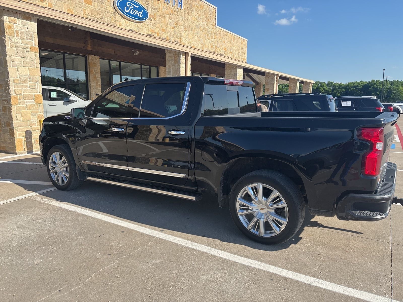 This 2022 Chevrolet Silverado 1500 High Country in Black comes with the following features: EcoTec3 5.3L V8 10-Speed Automatic 4WD High Capacity Suspension Package, High Country Premium Package (All-Weather Floor Liner (LPO), Power Sunroof, and Wheels: 22 x 9 Painted Aluminum), Preferred Equipment Group 3LZ (10-Way Power Driver Seat w/Lumbar, 10-Way Power Passenger Seat Adjuster w/Lumbar, 12.3 Multicolor Reconfigurable Digital Display, 120-Volt Bed Mounted Power Outlet, 120-Volt Instrument Panel Power Outlet, 2 USB Data Ports, 2nd Row Heated Outboard Seats, Auto-Dimming Inside Rear-View Mirror, Auto-Locking Rear Differential, Bed View Camera, Bluetooth® For Phone, Body-Color Painted Mirror Caps, Chevrolet Connected Access Capable, Chevytec Spray-On Black Bedliner, Chrome Assist Steps, Chrome Recovery Hooks, Color-Keyed Carpeting Floor Covering, Compass, Deep-Tinted Glass, Driver Memory, Dual Exhaust w/Polished Outlets, Dual Rear USB Ports (Charge Only), Electric Rear-Window Defogger, Electrical Steering Column Lock, Electronic Cruise Control, Floor Mounted Center Console, Front Carpeted Floor Mats, Front LED Fog Lamps, Front Rainsensing Wipers, HD Surround Vision, Heated Driver & Front Outboard Passenger Seats, Heated Steering Wheel, Hitch Guidance w/Hitch View, Integrated Trailer Brake Controller, Keyless Open & Start, Leather Wrapped Steering Wheel, LED Cargo Area Lighting, OnStar & Chevrolet Connected Services Capable, Outside Heated Power-Adjustable Mirrors, Perimeter Lighting, Power Front Passenger Windows w/Express Up/Down, Power Front Windows w/Driver Express Up/Down, Power Rear Windows w/Express Down, Power Sliding Rear Window w/Rear Defogger, Power Tailgate, Power Tilt & Telescoping Steering Column, Rear Carpeted Floor Mats, Rear Cross Traffic Alert-Braking, Rear Pedestrian Detection, Rear Wheelhouse Liners, Remote Vehicle Starter System, Safety Alert Seat, SiriusXM w/360L, Standard Tailgate, Steering Wheel Audio Controls, Theft Deterrent System (Unauthorized Entry), Trailer Camera Provisions, Trailer Side Blind Zone Alert, Trailering App, Ultrasonic Front & Rear Park Assist, Universal Home Remote, Ventilated Driver & Front Passenger Seats, Wi-Fi Hot Spot Capable, Wireless Charging, and Wireless Phone Projection), Technology Package (15 Diagonal Multicolor Head-Up Display, Adaptive Cruise Control, and Rear Camera Mirror), Trailering Package (Hitch Guidance), Up-Level Rear Seat w/Storage Package, Silverado 1500 High Country, Ford Blue Advantage: Blue Certified Certified, 4D Crew Cab, EcoTec3 5.3L V8, 10-Speed Automatic, 4WD, Black, Jet Black/Nightshift Blue Leather, 170 Amp Alternator, 3.23 Rear Axle Ratio, 4-Wheel Disc Brakes, 7 Speakers, ABS brakes, Adaptive Ride Control Suspension, Air Conditioning, Alloy wheels, AM/FM radio: SiriusXM with 360L, Apple CarPlay/Android Auto, Auto High-beam Headlights, Auto-dimming door mirrors, Auto-dimming Rear-View mirror, Automatic Emergency Braking, Automatic temperature control, Bodyside moldings, Brake assist, Bumpers: body-color, Delay-off headlights, Driver door bin, Driver vanity mirror, Dual front impact airbags, Dual front side impact airbags, Electronic Stability Control, Electronic Transmission Range Selector Shifter, Following Distance Indicator, Forward Collision Alert, Front anti-roll bar, Front Bucket Seats, Front Center Armrest, Front dual zone A/C, Front fog lights, Front License Plate Kit, Front Pedestrian Braking, Front reading lights, Front wheel independent suspension, Fully automatic headlights, Garage door transmitter, Genuine wood console insert, Genuine wood dashboard insert, Genuine wood door panel insert, Heated door mirrors, Heated front seats, Heated rear seats, Heated steering wheel, Illuminated entry, IntelliBeam Automatic High Beam On/Off, Lane Keep Assist w